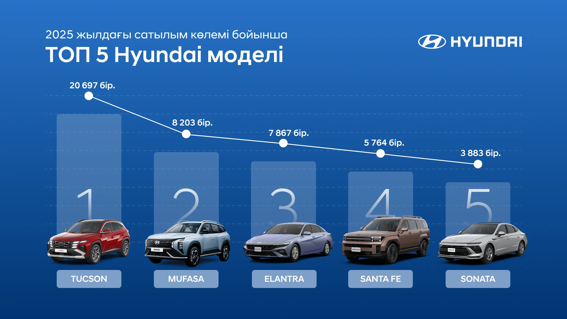 2025 жылы қазақстандықтар арасында ең үлкен сұранысқа Hyundai Tucson, Mufasa, Elantra, Santa Fe және Sonata модельдері ие болды. Бұл модельдер брендтің үздік 5 сатылымын қалыптастырып, сатып алушылардың Hyundai кроссоверлері мен седандарына деген тұрақты қызығушылығын растады.